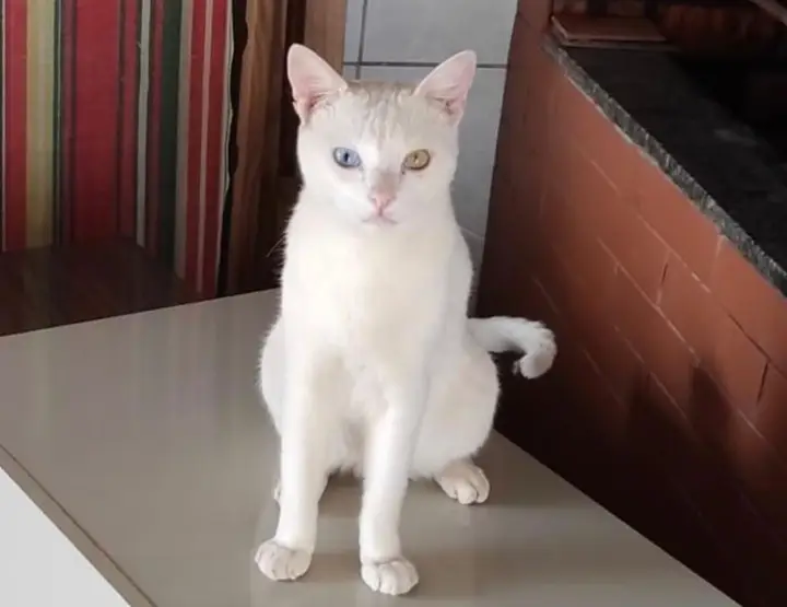 A Débora Francisca Liganani disse que o Mingau é companheiro da Lívia, que 12 anos. Ele desapareceu por volta das 12h. O gato tem um olho de cada cor