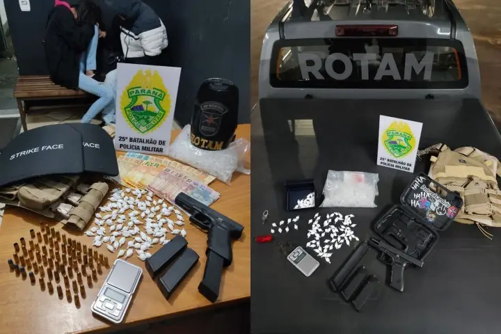 Ao todo foram apreendidos 107 buchas de cocaína, 444 pinos, uma pistola Glock 9mm, três carregadores – um destes sendo de pente alongado para comportar 32 munições -, munições do mesmo calibre, um colete tático e duas placas balísticos e R$ 1.772,00 em espécie.