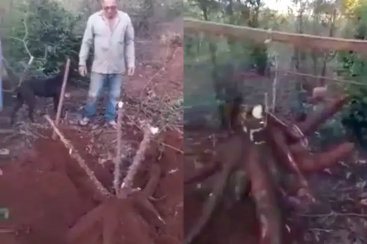 A retirada da raiz tuberosa foi registrada em vídeo – assista abaixo -, onde o morador e outros trabalhadores celebram a vitória. “Estamos tentando arrancar, mas não conseguimos, ficamos meia hora pra tirar”, brincou, enquanto tentava retirar o vegetal.