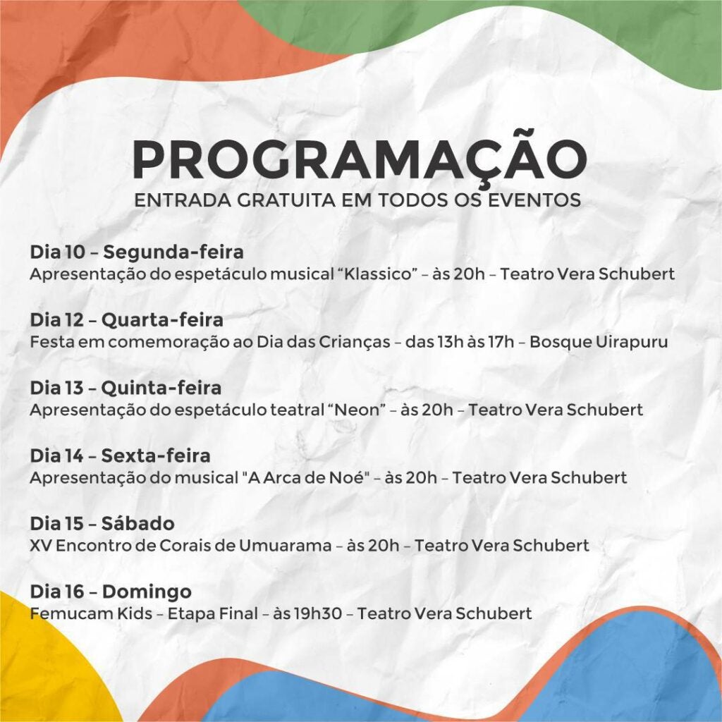 Confira abaixo a programação cultural que Umuarama terá entre os dias 10 e 16 de outubro: