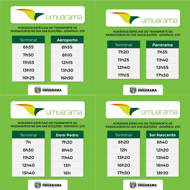 Atendendo uma solicitação do prefeito Hermes Pimentel, a Viação Umuarama – concessionária do transporte coletivo urbano – terá horários especiais de circulação de ônibus em todas as regiões da cidade no próximo domingo (2), dia em que serão realizadas as eleições gerais para escolha de presidente, governador, senador e deputados federais e estaduais.