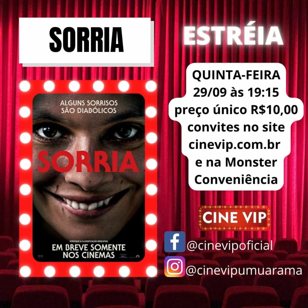 Os ingressos para ver o filme Sorria no Cine Vip podem ser adquiridos no site ou na Monster Conveniência.