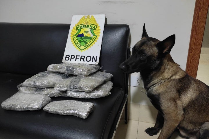 O cão de faro Nero, da 4ª Cia do BPFron (Batalhão de Polícia de Fronteira), encontrou, durante uma abordagem no início da noite desta quarta-feira (28), 900 gramas de Haxixe e 1.850 quilo de Skunk que estavam escondidos nas roupas de uma passageira de ônibus, em Umuarama.