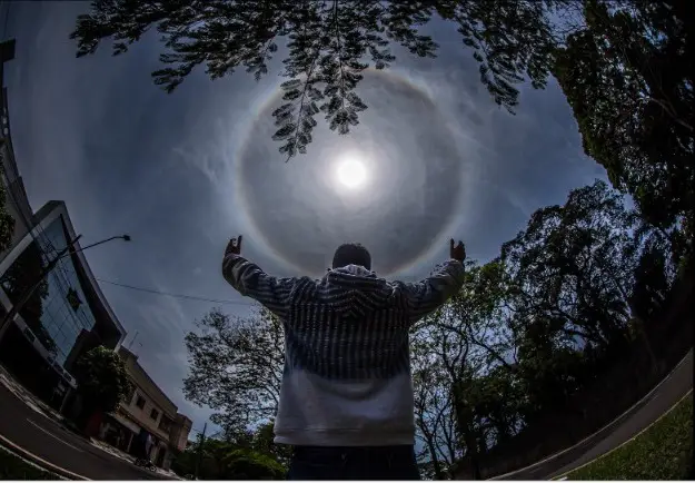 Apesar de despertar a curiosidade, o halo é um fenômeno natural. Ele ocorre quando a luz do Sol atravessa cristais de gelo presentes na atmosfera da Terra.