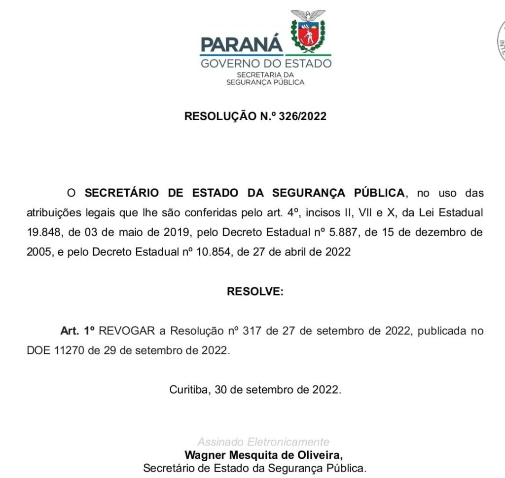 O secretário de estado da Segurança Pública (Sesp), Wagner Mesquita de Oliveira, divulgou nesta sexta-feira (30) a resolução nº 326/2022 onde revoga a Lei Seca nas eleições 2022 no Paraná. Desta forma, não há mais proibição da comercialização de bebidas alcoólicas no dia das eleições.