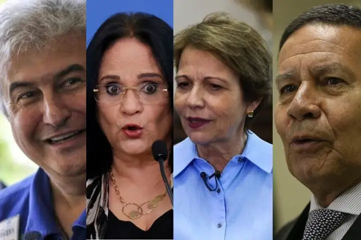 Os ex-ministros Marcos Pontes, Damares Alves e Tereza Cristina e o vice-presidente Hamilton Mourão, todos eleitos