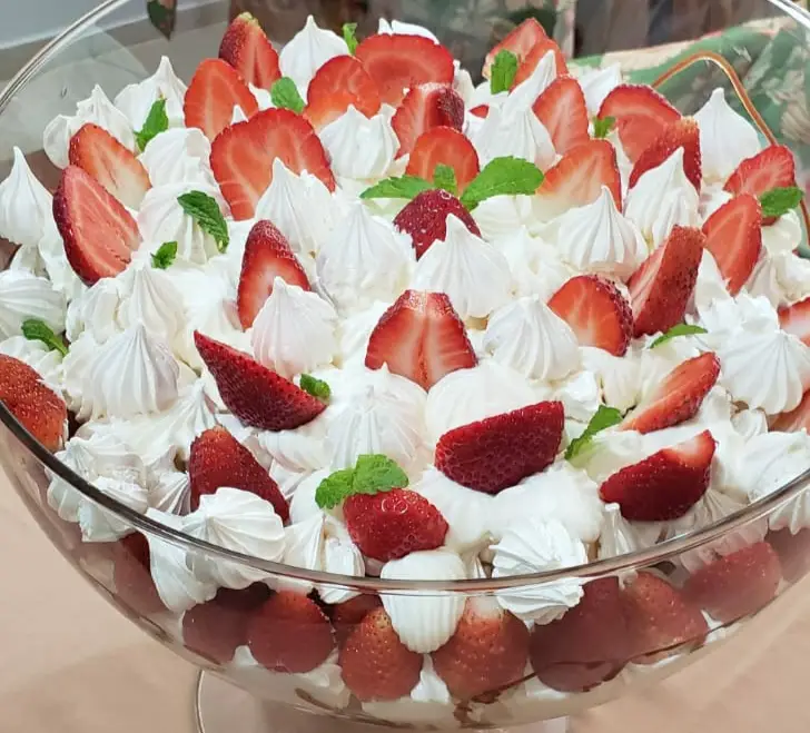 Bata o creme de leite ao ponto de chantilly. Coloque o açúcar. Corte os morangos em pedaços e reserve. Quebre levemente os suspiros. Em um pirex de vidro [de preferência] coloque em camadas o chantilly, depois o morango e o suspiro. Por cima, decore com morangos e suspiros. Sirva gelado.