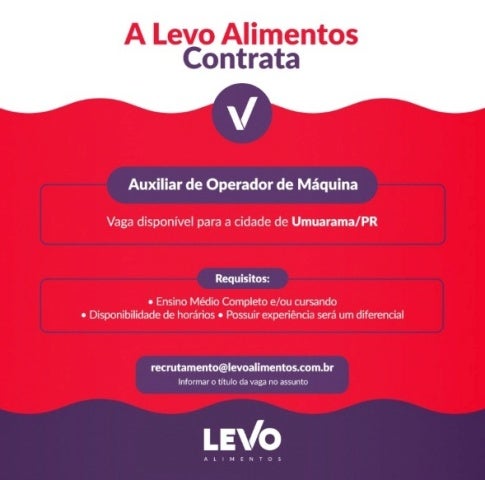 A Levo Alimentos está com uma vaga disponível para o cargo de auxiliar de operador de máquina, em Umuarama. É exigido ao candidato o ensino médio completo e/ou cursando, além de disponibilidade de horários. Possuir experiência será um diferencial.