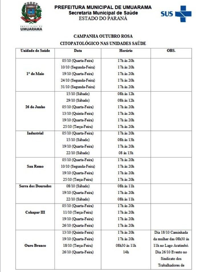 Desde 2002 a campanha Outubro Rosa é realizada no Brasil para falar sobre a importância dos exames preventivos de câncer de mama. Em Umuarama, uma série de atividades estão programadas durante todo o mês de outubro, que será dedicado à saúde da mulher, incluindo palestras, caminhadas, agendamentos de mamografias e a execução de citopatológicos (preventivo de câncer de útero) em todas as unidades de saúde.