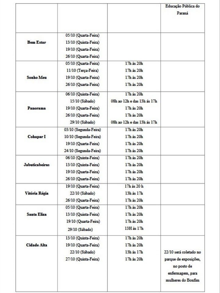 No dia 22 (um sábado), moradoras do bairro Parque Bonfim e entorno poderão realizar os exames preventivos no posto de enfermagem que será montado no Parque de Exposições, das 13h às 17h. Já no dia 26 (uma quarta-feira), as ações serão realizadas em evento no Sindicato dos Trabalhadores de Educação Pública do Paraná.