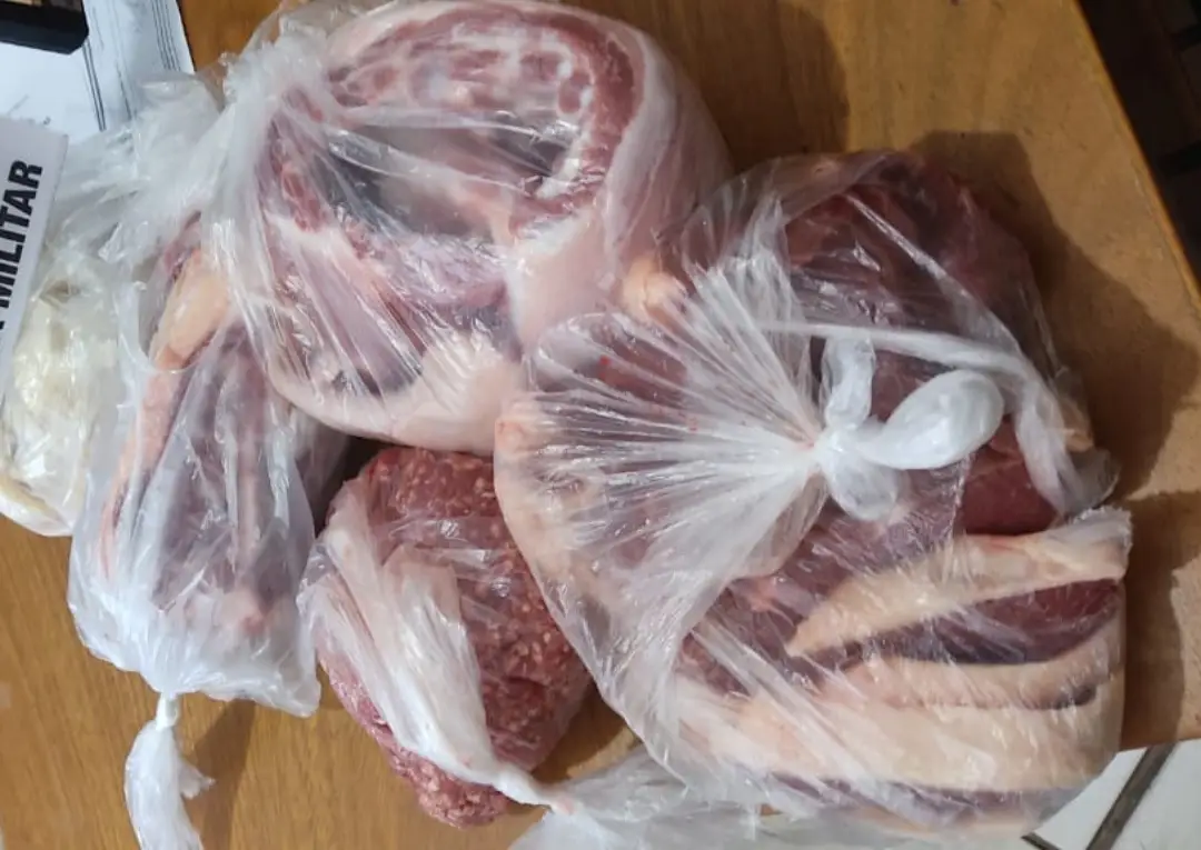 Um representante do mercado entrou em contato com a PM informando que uma cliente havia sido pega em flagrante após ter furtado a mercadoria. Ela foi monitorada por um funcionário furtando a carne que estava fracionada em seis pacotes.