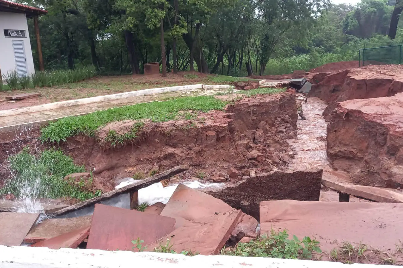 Uma erosão num trecho da pista de caminhada do Bosque do Índio, na Avenida Presidente Castelo Branco, em Umuarama, provocada pelas chuvas que iniciaram na noite desta terça-feira (11), deixou 28 bairros da cidade com abastecimento de água comprometido nesta quarta-feira (12), feriado de Dia da Padroeira do Brasil.