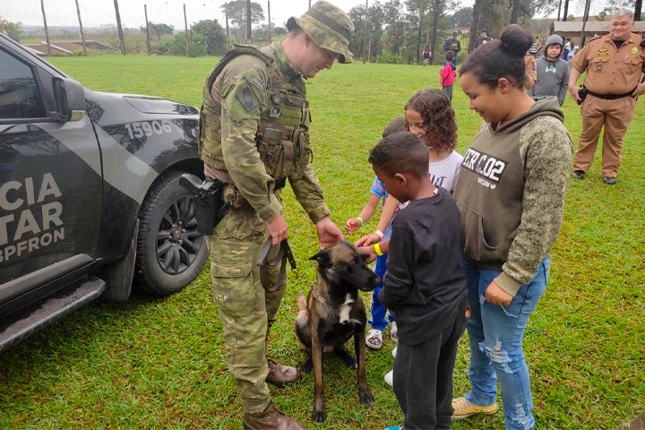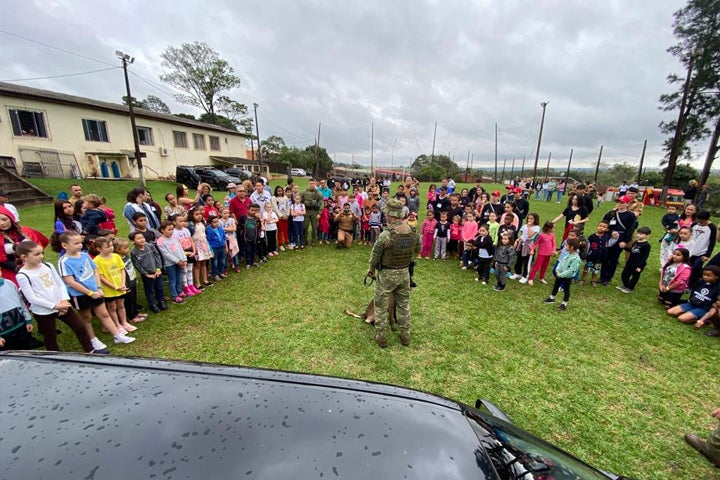 Policiais militares do Pelotão de Operações com Cães do BPFRON (Batalhão de Polícia de Fronteira), participaram, nesta quarta-feira (12), de um evento na sede do 7º Batalhão de Polícia Militar de Cruzeiro do Oeste, em comemoração ao Dia das Crianças.