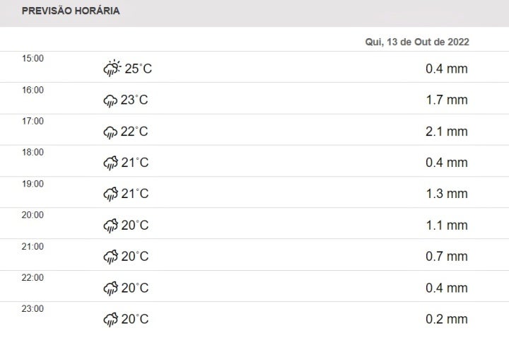 Abaixo a previsão de chuva e temperatura para a tarde e noite desta quinta-feira em Umuarama: