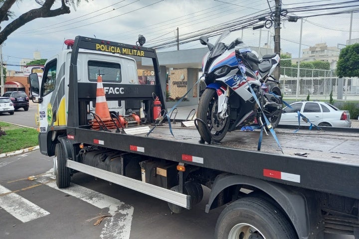 A moto, uma BMW Esportiva, sem placa, foi recolhida ao pátio do 25º BPM (Batalhão de Polícia Militar) por estar sem documentação regularizada. A PM informou que o Civic também tinha irregularidades.