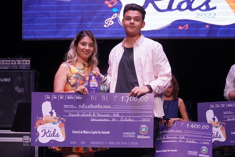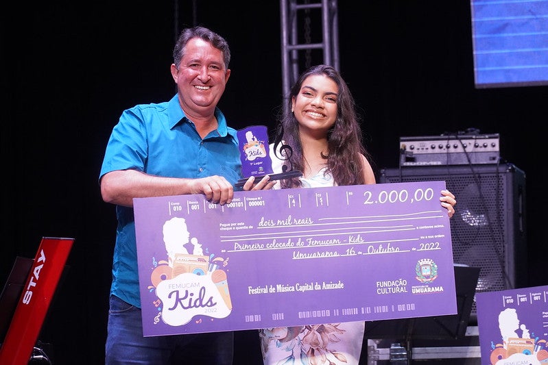 A 1ª edição do Femucam Kids ofereceu uma premiação de R$ 7.600 em dinheiro, mais troféus e medalhas, para os 10 primeiros colocados. “A vencedora ganhou R$ 2 mil, o segundo lugar levou R$ 1.700, a terceira R$ 1.400, o quarto R$ 900 e a quinto R$ 600, sendo que esses cinco primeiros ganham também um troféu especial. Do sexto ao décimo colocado, cada um levou R$ 200 para casa, mais uma medalha”, detalhou Rosana.