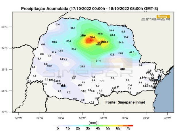 De acordo com o meteorologista Paulo Ricardo, da Simepar, entre a tarde de ontem e a madrugada de hoje, pancadas de chuvas de intensidades moderadas a fortes atuaram entre as regiões noroeste e norte do estado, provocando acumulados significativos nas regiões, com destaque para Apucarana que registrou 93,4 mm. Neste começo de manhã, a instabilidade segue presente sobre o Paraná. Chuvas de intensidades fracas a moderadas, são registradas entre as regiões norte, Campos Gerais, leste, centro-sul, sudeste e oeste do estado. O mapa mostra os acumulados de chuvas entre o dia de ontem até às 8h de hoje.