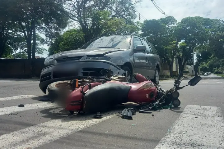 Um motociclista de 59 anos ficou ferido após uma colisão contra um automóvel no cruzamento da rua Arapongas com avenida Pirapó, no centro de Umuarama.
