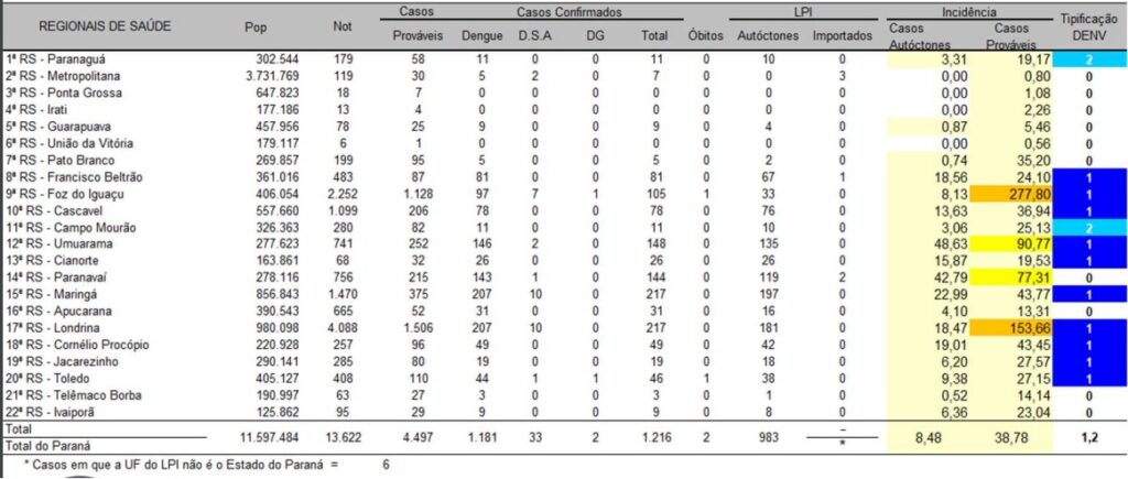 A Secretaria de Estado da Saúde (Sesa) divulgou nesta terça-feira (25) o boletim semanal da dengue com 56 novos casos da doença no Paraná. Ao todo são 1.216 confirmações em 168 municípios, 13.622 notificações de dengue, 3.279 casos em investigação e duas mortes (Foz do Iguaçu e Maripá) neste período epidemiológico.
