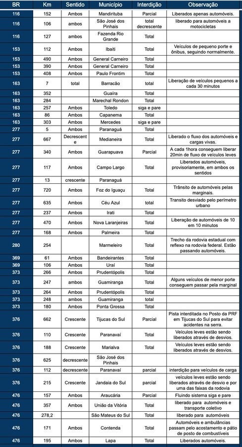 A PRF divulgou às 18h a atualização das condições de tráfego nas rodovias federais do Paraná. Confira a tabela: