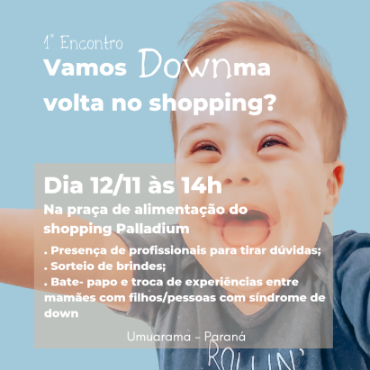 SERVIÇO – 1° Encontro Vamos Down Uma Volta no Shopping? – Data: 12/11/2022 – Horário: 14h – Local: Shopping Palladium Umuarama – Informações: (44) 98447-0259 (Whatsapp).