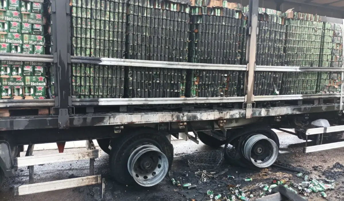 Um caminhão carregado de cerveja e guaraná teve parte da carga danificada após um princípio de incêndio no Contorno Sul, em Curitiba. Sem conseguir desviar, o motorista passou por cima de um colchão que estava jogado na pista.