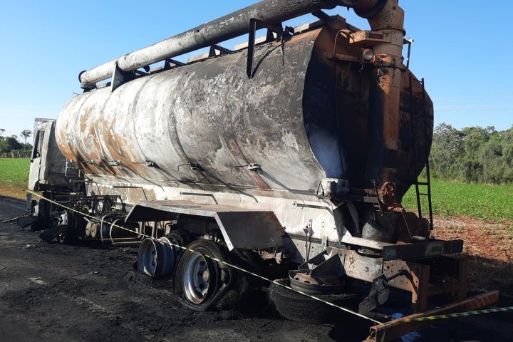 Um caminhão silo que trafegava pela PR-364 pegou fogo e ficou completamente destruído nesta quarta-feira (9) por volta das 15h20 no trecho entre Palotina e Assis Chateubriand.