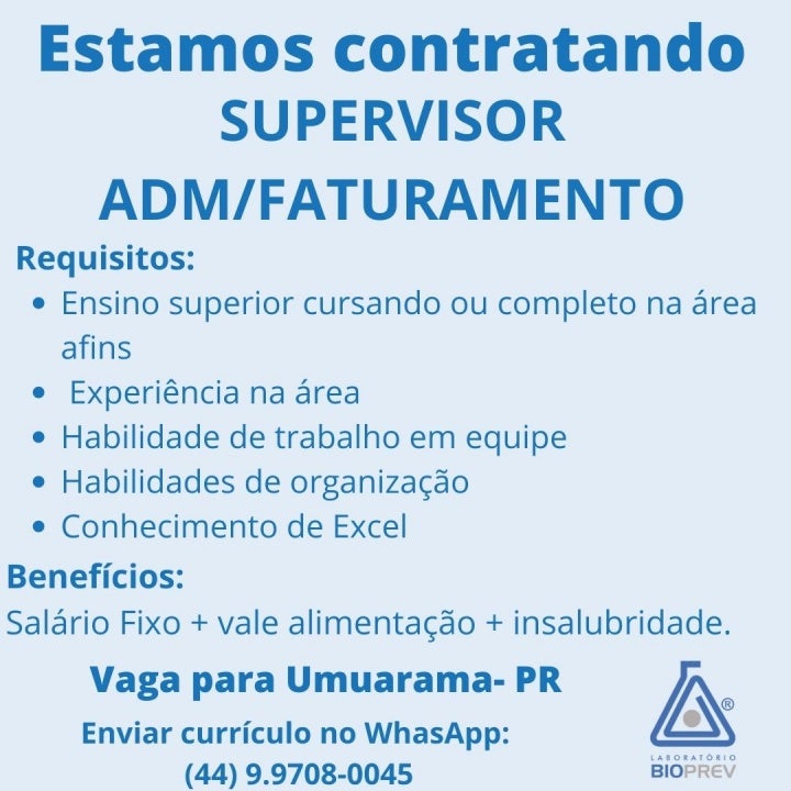 O Laboratório de análises clínicas Bioprev também divulgou que está com uma vaga aberta para o cargo de supervisor administrativo no setor de faturamento da empresa. Dentre os requisitos, é exigido que a pessoa esteja cursando ou possua ensino superior na área. Também é necessário experiência, habilidade para trabalho em equipe, boa organização e conhecimento de Excel.