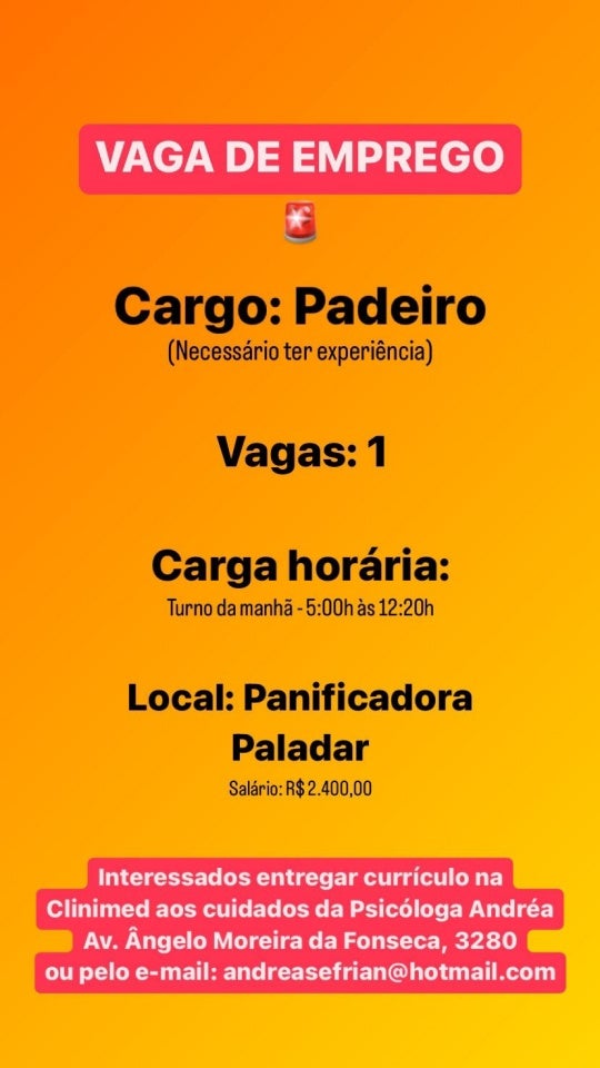 A Panificadora Paladar também divulgou que está com uma vaga disponível para padeiro. Dentre os requisitos é exigido que o candidato possua experiência na função e disponibilidade para trabalhar no turno da manhã, das 5h às 12h20. O salário é de R$ 2.400, além de hora extra.