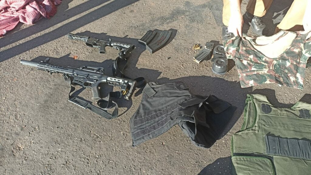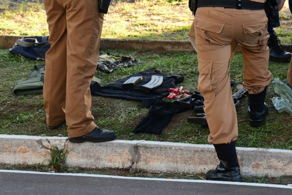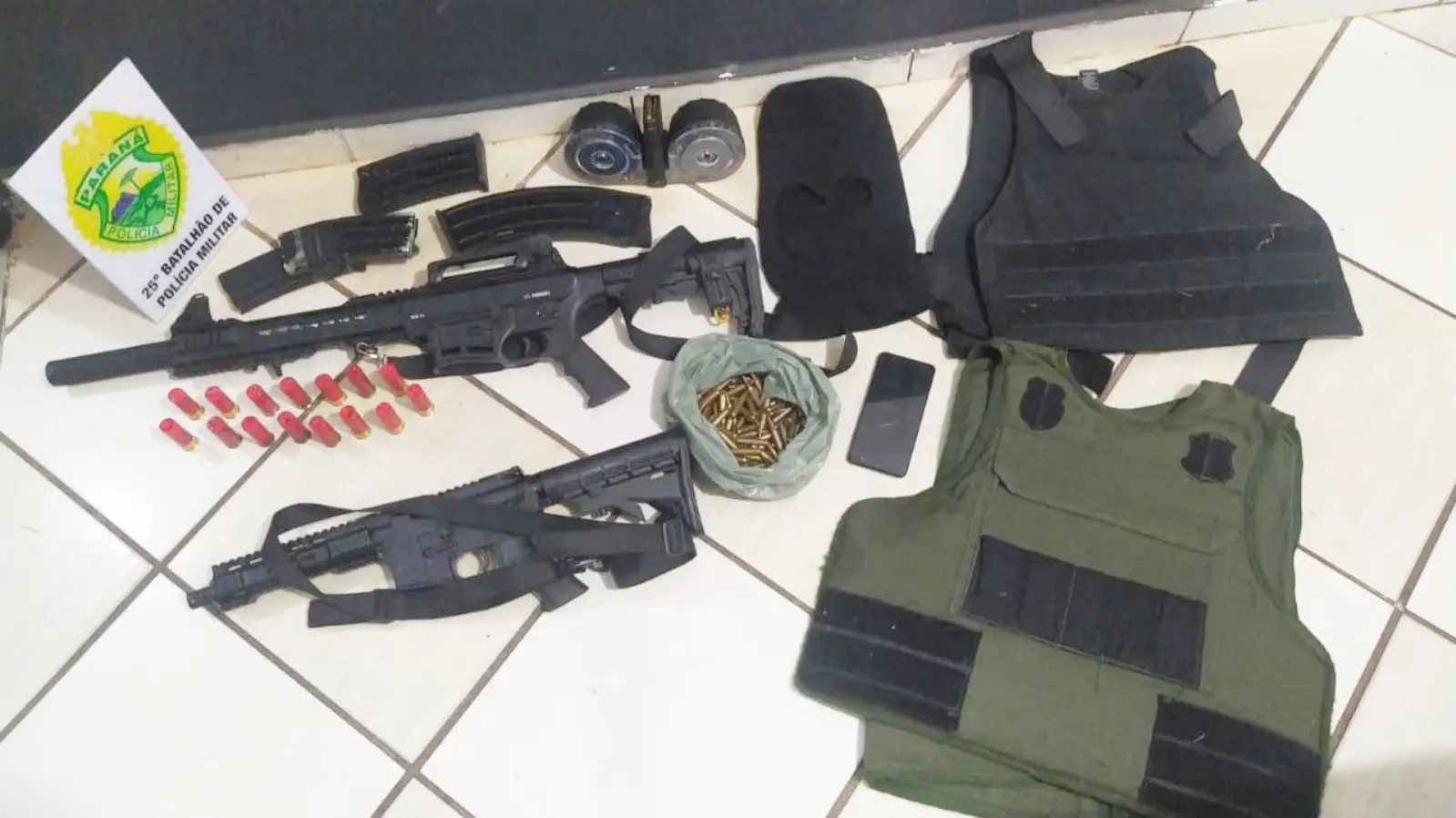 A PM informou que foram apreendidos um fuzil 556, uma espingarda calibre 12, uma pistola 9mm, dois coletes a prova de bala, o veículo e munições (190 cartuchos calibres 556 e 15 cartuchos calibre 12).