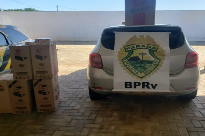 Policiais Rodoviários do Posto de Iporã apreenderam nesta quinta-feira (17), na PR-323, um veículo Renault Sandero com placas de Mundo Novo, Mato Grosso do Sul, carregado com cigarros contrabandeados do Paraguai.