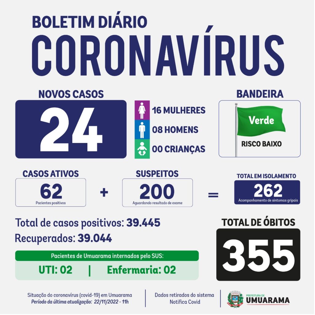 Mais de 260 pessoas estão em isolamento domiciliar por terem sintomas de gripe, segundo informou a Secretaria de Saúde de Umuarama em seu Boletim Covid desta terça-feira (22) – são 62 casos ativos e outros 200 tidos como suspeitos. Os novos casos anunciados são 24, sendo 16 mulheres (67%), oito homens (33%) e nenhuma criança.