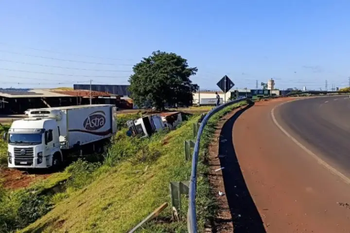 Um caminhão que transportava 15 mil quilos de carne bovina acabou perdendo o controle por volta das 4h30 da madrugada desta sexta-feira (25), na PR-323, próximo ao Parque Itaipu, em Maringá.
