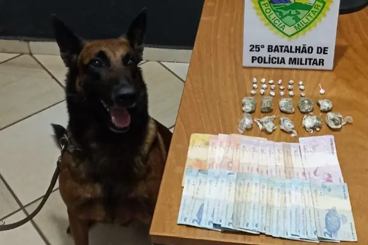 Foi então que equipes da Rotam juntamente com o Canil do 25º abordaram a suspeita, que permitiu a vistoria dos policiais pela casa e pelo imóvel abandonado. Em ambos os lugares, com auxílio do cão farejador Iron, as equipes encontraram R$ 134 em dinheiro que estava dentro de um freezer abandonado, além de 10 porções de maconha totalizando 37 gramas, 18 porções de crack totalizando 3,4 gramas e uma bucha de cocaína totalizando 1 grama.