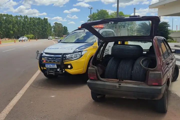 Conforme a PRE, durante operação de fiscalização na rodovia foi abordado o veículo Fiat/Uno de cor vermelha conduzindo por um homem de 51 anos. No momento da abordagem, o condutor desceu do carro e informou a equipe que estava transportando 50 pneus oriundos do Paraguai.
