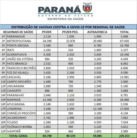 O Governo do Estado, por meio da Secretaria de Estado de Saúde (Sesa), realiza nesta terça-feira (29) a entrega de 229.253 vacinas contra a Covid-19. Destas, a Regional de Saúde de Umuarama irá receber 5.140 novas doses de imunizantes.