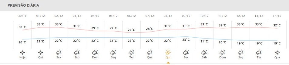 A chuva não ajuda muito na sexta-feira (2), que terá temperaturas semelhantes ao dia anterior, entre 33°C e 22°C, de acordo com o Simepar. Nos dias seguintes, apesar de todos registrarem chuva – com exceção do dia 8/12, que deve ser ensolarado – o calor ainda será bastante presente. Em geral, o dia mais fresco será na próxima terça-feira (6/12), que deve contar com temperaturas entre 22°C e 27°C.