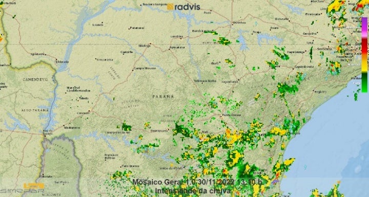 As chuvas estão mais presentes neste início de tarde no Paraná, entre os setores sul e leste. Na imagem de radar abaixo, nota-se a concentração de pontos de chuvas, sendo que em algumas das acompanhadas de trovoadas.