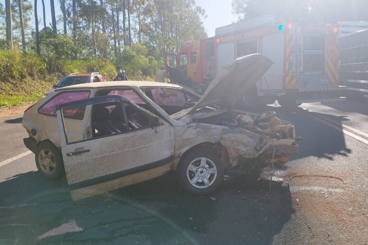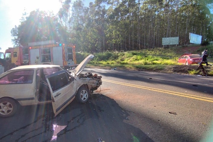 O acidente envolveu três automóveis e uma motocicleta que seguiam pela rodovia