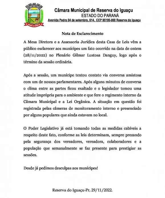 Após a discussão, o homem foi até a Delegacia da cidade e registrou um boletim de ocorrência contra o parlamentar. Depois do ocorrido, a Câmara de Vereadores soltou uma nota nesta terça-feira (29), se posicionando sobre a situação.