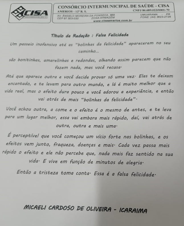 A redação elaborada pela jovem foi nomeada “Falsa Felicidade”, onde ela expõe uma crítica à satisfação temporária e nociva das drogas. Nela, a jovem traça paralelos sobre a facilidade com que a pessoa entra nesse mundo e a tristeza resultante dessa terrível decisão.