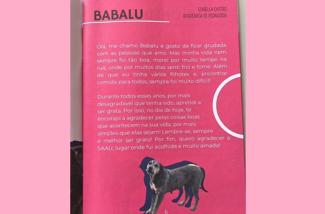 As acadêmicas do curso de Pedagogia da UniAlfa Faculdade farão o lançamento de um livro sobre os animais da Saau (Sociedade de Amparo aos Animais de Umuarama). A obra ‘Aumores da Saau’ conta histórias de vários animais resgatados pela entidade.