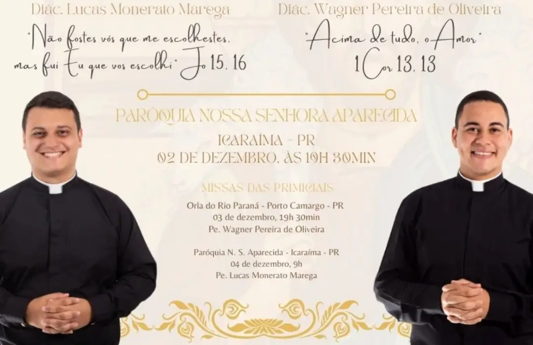Nesta sexta-feira (2), às 19h30, na Paróquia Nossa Senhora Aparecida, de Icaraíma, serão ordenados presbíteros os Diáconos Lucas Monerato Marega e Wagner Pereira de Oliveira.