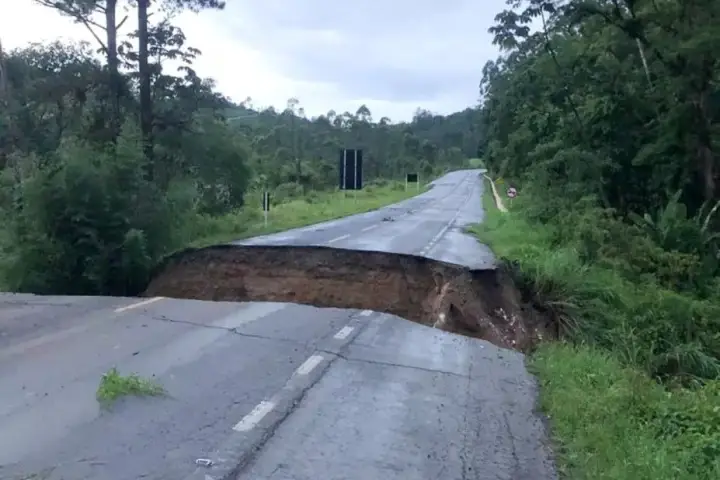 De acordo com as informações, a interdição fica na altura do km 96. O buraco, de proporções gigantescas, teria sido provocado por conta dos temporais que atingem a região desde a madrugada desta segunda.