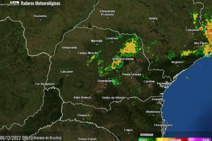 Manhã segue com chuvas em parte do Paraná. No momento chove especialmente entre os Campos Gerais e o norte pioneiro. No geral, as chuvas são fracas, acompanhadas por poucas descargas atmosféricas. No oeste e no sudoeste o sol predomina, com rápido aquecimento para as próximas horas, afirma o meteorologista Samuel Braun, da Simepar.