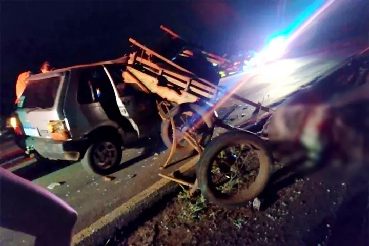 Quatro pessoas ficaram feridas em um acidente entre uma charrete, puxada por um cavalo, e um veículo Uno, na noite do último domingo (04), na BR-272, em Guaíra. De acordo com as informações, a batida aconteceu na região dos motéis.