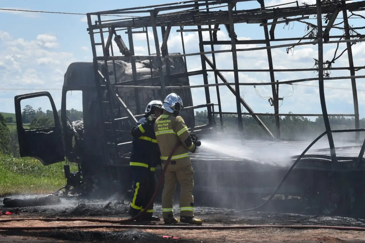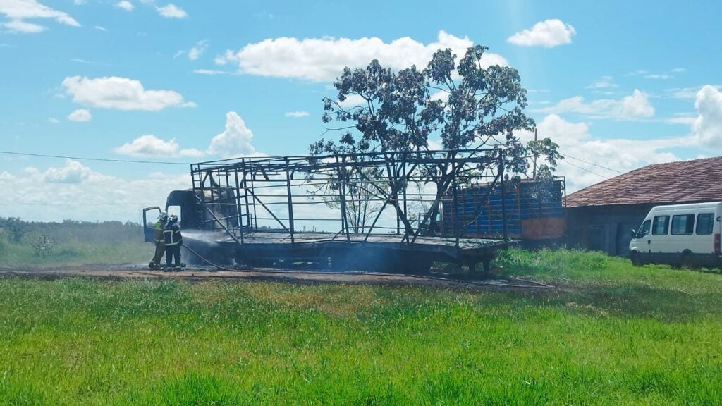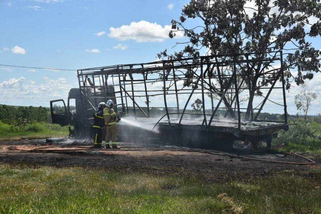 Um caminhão utilizado no transporte de frangos vivos ficou destruído após pegar fogo em Umuarama. A situação aconteceu na tarde desta terça-feira (6), na região da Estrada São Tomé.