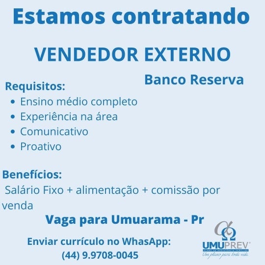 A Umuprev também divulgou que está com uma vaga disponível para o cargo de Vendedor Reserva em Umuarama. Dentre os requisitos é exigido que o candidato tenha ensino médio completo, possua experiência na área, seja proativo e comunicativo.