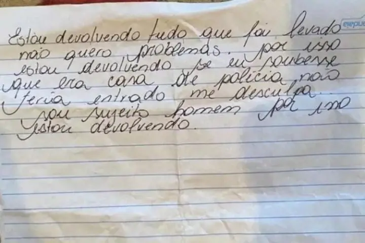 “Estou devolvendo tudo que foi levado, não quero problemas. Por isso, estou devolvendo. Se eu soubesse que era casa de polícia não teria entrado, me desculpe. Sou sujeito homem, por isso estou devolvendo”, dizia o bilhete.