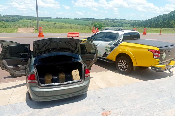Foi então que no Km 347 da PR-323 os policiais conseguiram realizar a abordagem. Dentro do veículo, as equipes encontraram, embaixo do porta-malas e atrás dos bancos dianteiros, oito fardos grandes e um pequeno que posteriormente totalizaram 148,800 quilos da droga.